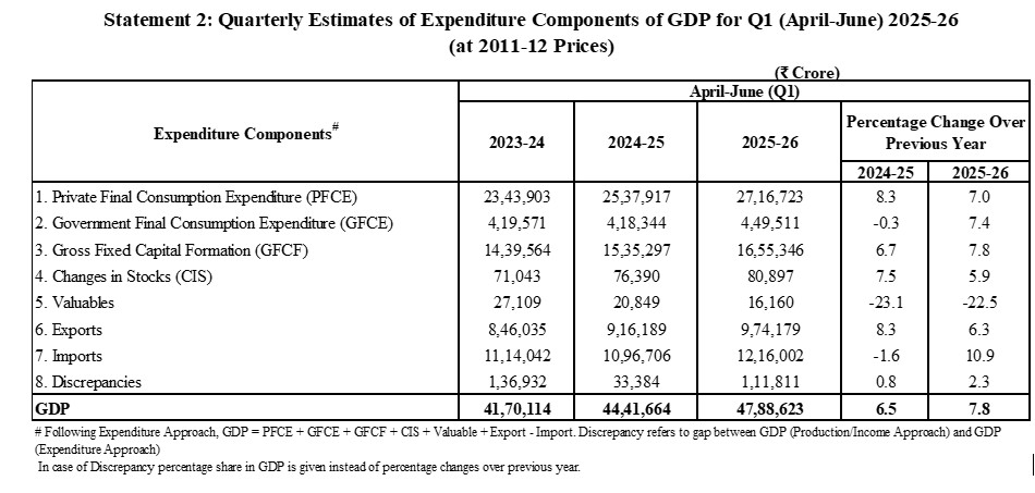 वित्त वर्ष 2025-26 को पहिलो त्रैमासिकमा वास्तविक जीडीपी वा स्थिर मूल्यमा जीडीपी 47.89 लाख करोड रुपियाँ अनुमान गरिएको छ, जुन वित्त वर्ष 2024-25 को पहिलो त्रैमासिकमा 44.42 लाख करोड रुपियाँ थियो, जसले 7.8% वृद्धि दर दर्ता गरेको छ। वित्त वर्ष 2025-26 को पहिलो त्रैमासिकमा नाममात्र जीडीपी वा वर्तमान मूल्यमा जीडीपी 86.05 लाख करोड़ रुपियाँ रहने अनुमान छ, जबकि वित्त वर्ष 2024-25 को पहिलो त्रैमासिकमा यो 79.08 लाख करोड़ रुपियाँ थियो, जसले 8.8% को वृद्धि दरलाई दर्शाउँछ।