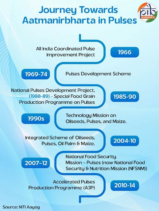 भारतले बितेका केही दसकदेखि लक्षित पहलको माध्यमद्वारा दालको उत्पादनमा लगातार बढावा दिइरहेको छ। वर्ष 1966 मा अखिल भारतीय समन्वित दलहन सुधार परियोजनादेखि लिएर त्वरित दलहन उत्पादन कार्यक्रम (ए-3-पी) (2010-14) सम्म उत्पादकता बढाउन र दीर्घकालिक आत्मनिर्भरताको निम्ति आधार तयार गर्नका लागि यी पहलहरूमाथि काम गर्दैआएको छ।