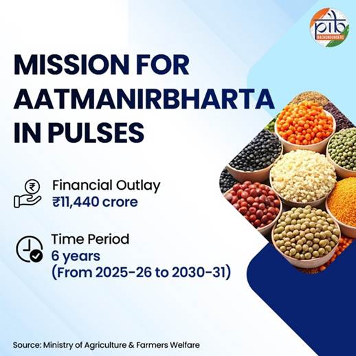 - प्रधानमन्त्रीले 11 अक्टोबर, 2025 को दिन ₹11,440 करोडको बजेटीय दरबन्दीका साथ दालमा आत्मनिर्भरता मिशन (2025-26 देखि 2030-31) शुभारम्भ गरे।