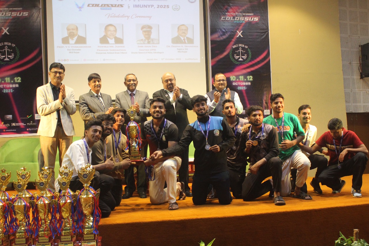 हिदायतुल्लाह राष्ट्रीय विधि विश्वविद्यालय (एचएनएलयू), रायपुर के वार्षिक तीन दिवसीय महोत्सव ‘कोलॉसस 2025: स्पोर्ट्स | कल्चरल | लिटरेरी’ का रविवार को भव्य समापन हुआ। समापन समारोह के मुख्य अतिथि न्यायमूर्ति प्रकाश श्रीवास्तव, अध्यक्ष, राष्ट्रीय हरित अधिकरण (नेशनल ग्रीन ट्रिब्यूनल) एवं पूर्व मुख्य न्यायाधीश, कोलकाता उच्च न्यायालय रहे।