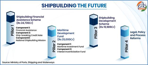- जहाज निर्माण विकास योजनाले ₹19,989 करोडको परिव्ययका साथ पूँजीगत सहयोग, जोखिम कभरेज तथा जहाज निर्माण समूहका लागि क्षमता निर्माण प्रदान गर्नेछ।