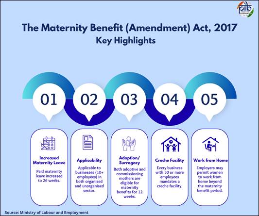 मातृत्व लाभ ऐन, १९६१ ले महिला कर्मचारीहरूलाई मातृत्व सम्बन्धि सुविधा प्रदान गर्दछ। यस ऐनलाई वर्ष २०१७ मा संशोधन गरी मातृत्व बिदा १२ हप्ता बाट बढ़ाएर २६ हप्ता पुर्याइएको छ। मातृत्व बिदा दिने व्यवस्था बाहेक, ५० वा त्यो भन्दा धेर कर्मचारी भएका कार्यालयहरूले कार्यस्थलमा शिशु स्याहार केन्द्र स्थापना गरी सञ्चालन गर्नुपर्ने व्यवस्था पनि ऐनले अनिवार्य गरेको छ। यो शिशु स्याहार केन्द्रले कार्यरत आमाहरूलाई आफ्ना बालबालिकालाई काम गर्ने समयमा सुरक्षित स्थानमा राख्न सहज बनाउने उद्देश्य राख्दछ। अब यो ऐनले सरोगेट आमा अर्थात किरायाको गर्भधारण गर्ने महिलाहरूलाई पनि समेट्ने प्रावधानहरू समावेश गरेको छ, जसले कार्यशक्तिमा महिलाहरूको सहभागिता प्रोत्साहन र समर्थन गर्ने लक्ष्य राख्दछ।