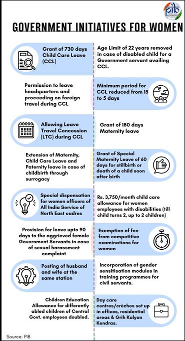 सरकारले कार्यस्थलमा समावेशिता, महिला कर्मचारीहरूको कार्यस्थल कल्याण तथा समग्र भलाइ प्रवर्द्धन गर्न विभिन्न महिलामुखी पहलहरू सञ्चालन गरेको छ। यी उपायहरूमा, अन्य कुराहरूका साथै, निम्न समावेश छन्: