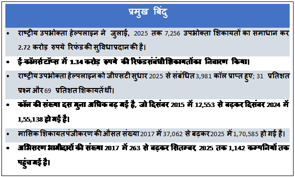 अगली पीढ़ी के जीएसटी सुधार 2025 के कार्यान्वयन के बाद से, राष्ट्रीय उपभोक्ता हेल्पलाइन पर 2 अक्टूबर 2025 तक जीएसटी मुद्दों से संबंधित 3,981 कॉल दर्ज की गई। इनमें से 31 प्रतिशत प्रश्न थे और 69 प्रतिशत औपचारिक शिकायतें थीं, जिन पर आगे की कार्रवाई के लिए विचार किया गया।