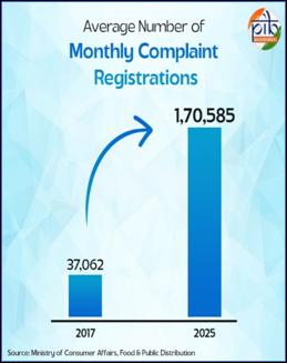 तकनीक का लाभ उठाने से हेल्पलाइन की पहुंच और दक्षता में उल्लेखनीय वृद्धि हुई है। कॉल की संख्या दस गुना से भी ज़्यादा बढ़ गई है। कॉल की संख्या दिसंबर 2015 में 12,553 से बढ़कर दिसंबर 2024 में 1,55,138 हो गई है। वर्तमान में इस प्लेटफ़ॉर्म पर प्रति माह एक लाख से अधिक शिकायतें बढ़ते उपभोक्ता विश्वास को दर्शाता है। मासिक शिकायत पंजीकरण की औसत संख्या 2017 में 37,062 से बढ़कर 2025 में 1,70,585 हो गई है। डिजिटल माध्यमों की शुरुआत के साथ, हेल्पलाइन पर लगभग 65 प्रतिशत उपभोक्ता शिकायतें ऑनलाइन और डिजिटल माध्यमों से दर्ज की जाती हैं। व्हाट्सएप के माध्यम से शिकायत पंजीकरण में उल्लेखनीय वृद्धि देखी गई है, जो मार्च 2023 में 3 प्रतिशत से बढ़कर मार्च 2025 में 20 प्रतिशत हो गई है।