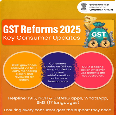 उपभोक्ता मामलों के विभाग ने राष्ट्रीय उपभोक्ता हेल्पलाइन को अगली पीढ़ी के जीएसटी सुधार, 2025 के साथ एकीकृत किया है। सुधारों को सितंबर 2025 में केंद्रीय वित्त मंत्री की अध्यक्षता में जीएसटी परिषद की 56वीं बैठक में अनुमोदित किया गया था। ये प्रधानमंत्री द्वारा स्वतंत्रता दिवस 2025 के संबोधन में उल्लिखित दृष्टिकोण के अनुरूप हैं। 22 सितंबर 2025 से संशोधित जीएसटी शुल्क, दरें और छूट लागू होने के बाद उपभोक्ताओं के प्रश्नों और शिकायतों में संभावित वृद्धि को नियंत्रित करने के लिए, INGRAM पोर्टल पर एक समर्पित श्रेणी बनाई गई है। इस श्रेणी में ऑटोमोबाइल, बैंकिंग, टिकाऊ उपभोक्ता वस्तुएं, ई-कॉमर्स, फास्ट मूविंग कंज्यूमर गुड्स और अन्य जैसे प्रमुख क्षेत्र शामिल हैं, जहां उपभोक्ता सीधे जीएसटी संबंधी शिकायतें दर्ज कर सकते हैं।