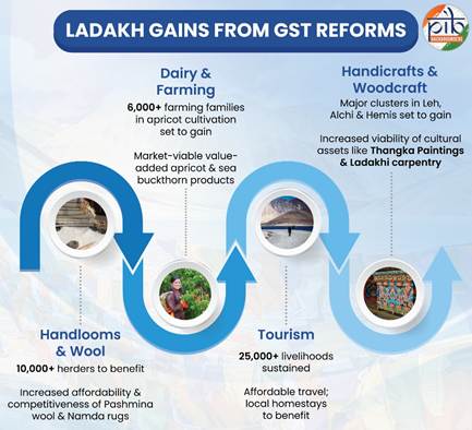 उत्पादों और सेवाओं की विस्तृत विविधता की श्रेणी में हाल ही में जीएसटी में कटौती से लद्दाख की समृद्ध अर्थव्यवस्था पर भी असर पड़ेगा और इससे कारीगरों, किसानों और छोटे उद्यमों को राहत मिलेगी। साथ ही ये सुधार आजीविका सृजन, सांस्कृतिक संरक्षण और लद्दाख की अर्थव्यवस्था के सतत विकास का समर्थन करेंगे।