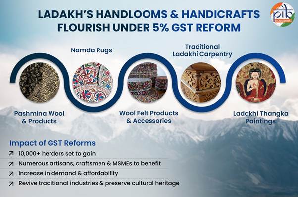 हाल ही में किए गए जीएसटी सुधार लद्दाख के पारंपरिक कारीगरों और किसानों को सशक्त बनाकर उसकी अर्थव्यवस्था के लिए एक परिवर्तनकारी कदम हैं। पश्मीना बुनकरों और खुबानी उत्पादकों से लेकर डालेचुक (सी बकथॉर्न) की पैदावार करने वाले और होमस्टे मालिकों तक, प्रत्येक क्षेत्र को कम लागत, बेहतर प्रतिस्पर्धात्मकता और उच्च आय के माध्यम से लाभ प्राप्त करना है।