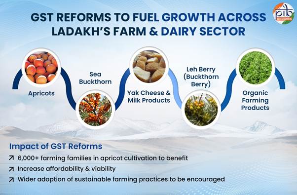 - जीएसटी कम होने से डेयरी और जैविक खेती में बेहतर आय और प्रतिस्पर्धात्मकता देखी जा रही है; खुबानी की खेती में लगे 6,000+ किसान परिवारों को लाभ होगा