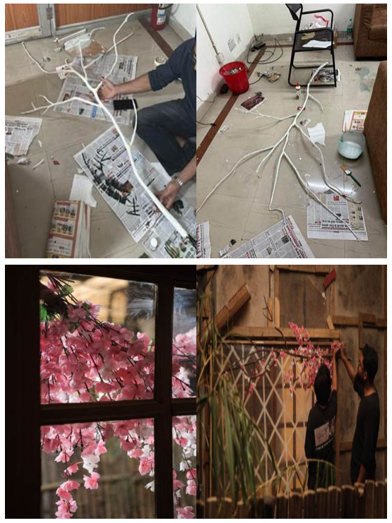 എസ്.ആർ.എഫ്.ടി.ഐയിലെ വിദ്യാർത്ഥികൾ ബോഗൻവില്ല മരം പശ്ചാത്തലമായ ഒരു ജാപ്പനീസ് വീട് പുനർനിർമ്മിച്ചു. ബോഗൻവില്ല പൂക്കൾ വളരെ സൗമ്യമാണ്, ഷൂട്ടിംഗ് ഫ്ലോറിലെ വെളിച്ചത്തിൻ്റെ ഉയർന്ന താപനില അവയ്ക്ക് താങ്ങാൻ കഴിയില്ല. അതിനാൽ, പഴയ പത്രങ്ങളിൽ നിന്നും ഉപേക്ഷിക്കപ്പെട്ട കാർഡ് ബോർഡുകളിൽ നിന്നും മരം കൃത്രിമമായി സൃഷ്ടിച്ചു. സെറ്റിലെ പശ്ചാത്തലത്തിന്റെ ആവശ്യകത അനുസരിച്ചാണ് മരത്തിന്റെ ആകൃതി സൃഷ്ടിച്ചത്. മരത്തിന്റെ നിർമ്മാണ പ്രക്രിയ 1 മുതൽ 5 വരെയുള്ള ചിത്രങ്ങളിൽ നൽകിയിരിക്കുന്നു.