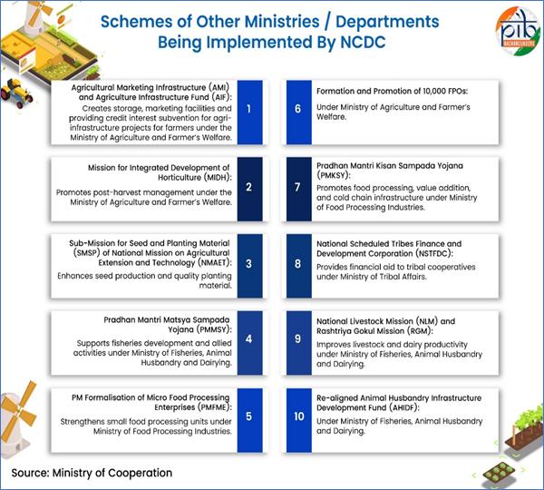 একটি পূর্ণাঙ্গ চিত্র প্রদানের লক্ষ্যে উল্লেখযোগ্য যে এনসিডিসি বিভিন্ন কেন্দ্রীয় ও কেন্দ্র-সহায়িত প্রকল্প বাস্তবায়ন করছে। এই প্রকল্পগুলির মাধ্যমে কৃষি, উদ্যানপালন, মৎস্য, দুগ্ধ, পশুপালন, খাদ্য প্রক্রিয়াকরণ, বিপণন, সংরক্ষণ এবং শীতল শৃঙ্খল পরিকাঠামো সহ বিভিন্ন ক্ষেত্রের সমবায় প্রতিষ্ঠানের সার্বিক উন্নয়ন হচ্ছে।