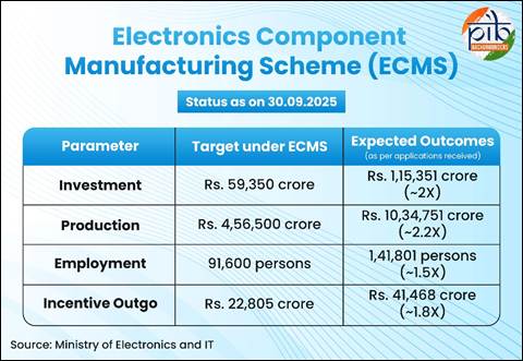 इलेक्ट्रोनिक्स कम्पोनेन्ट म्यानुफ्याक्चरिङ स्किम (ईसीएमएस) ८ अप्रेल २०२५ मा सूचित गरिएको हो, जसको कुल बजेट रू. २२,९१९ करोड़ (लगभग अमेरिकी डलर २.७ अर्ब) बराबर छ। यस योजनाको अवधि ६ वर्षको छ, साथै एक वर्षको वैकल्पिक तयारी अवधि पनि रहेको छ। यस योजनाको उद्देश्य देशमा इलेक्ट्रोनिक्स कम्पोनेन्ट उत्पादनका लागि सुदृढ़ र आत्मनिर्भर पारिस्थितिकी तन्त्र निर्माण गर्नु हो। यसको मुख्य ध्यान सम्पूर्ण मूल्य शृंखलामा घरेलु र अन्तर्राष्ट्रिय दुवै प्रकारका लगानी आकर्षित गर्न, घरेलु मूल्य अभिवृद्धि बढ़ाउन, र भारतलाई विश्व इलेक्ट्रोनिक्स व्यापारमा एक प्रमुख खेलाड़ीका रूपमा स्थापित गर्न केन्द्रित गरिएको छ।