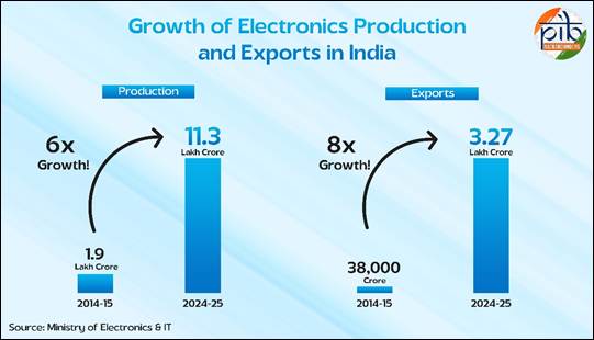 देशको इलेक्ट्रोनिक्स उत्पादन वर्ष २०१४–१५ मा रू.१.९ लाख करोड़बाट बढ़ेर २०२४–२५ मा रू. ११.३ लाख करोड़ पुगेको छ, जसले छ गुणा वृद्धि देखाउँदछ। यसै अवधिमा निर्यात रू. ३८,००० करोड़बाट बढ़ेर रू.३.२७ लाख करोड़ पुगेको छ, जुन आठ गुणाको वृद्धि हो। बितेको दशकमा, इलेक्ट्रोनिक्स उत्पादन क्षेत्रले देशभरि लगभग २५ लाख रोजगारीका अवसरहरू सृजना गरेको छ।
