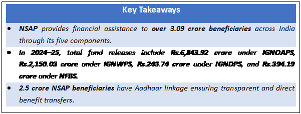 জাতীয় সামাজিক সহায়তা কর্মসূচি ভারতের সামাজিক সুরক্ষা ব্যবস্থার একটি প্রধান স্তম্ভ হিসেবে কাজ করে, যা প্রয়োজনীয় নাগরিকদের অত্যাবশ্যক সহায়তা প্রদান করে। এর বিভিন্ন উপাদানের মাধ্যমে - ইন্দিরা গান্ধী ন্যাশনাল ওল্ড এজ পেনশন স্কীম, ইন্দিরা গান্ধী ন্যাশনাল উইডো পেনশন স্কীম, ইন্দিরা গান্ধী ন্যাশনাল ডিসেবিলিটি পেনশন স্কীম, অন্নপূর্ণা স্কীম এবং ন্যাশনাল ফ্যামিলি বেনিফিট স্কীম - এই কর্মসূচি নিশ্চিত করে যে, প্রবীণ নাগরিক, বিধবা, প্রতিবন্ধী ব্যক্তি এবং প্রাথমিক উপার্জনকারীকে হারানো পরিবারগুলি যেন নিয়মিত আর্থিক সহায়তা এবং খাদ্য সুরক্ষা পায়। আধার-ভিত্তিক যাচাইকরণকে যুক্ত করে এবং সরাসরি সুবিধা প্রদান উৎসাহিত করার মাধ্যমে, এনএসএপি স্বচ্ছতা বাড়িয়েছে, দুর্নীতি কমিয়েছে, এবং লক্ষ লক্ষ সুবিধাভোগীর প্রয়োজনে কল্যাণমূলক পরিষেবা প্রদানকে শক্তিশালী করেছে। সম্মিলিতভাবে, এই পদক্ষেপগুলি গুরুত্বপূর্ণ আর্থিক সুরাহা দেয় এবং সমগ্র দেশে একটি আরও অন্তর্ভুক্তিমূলক ও ন্যায়সঙ্গত সামাজিক নিরাপত্তা সংযোগ তৈরি করতে অবদান রাখে।