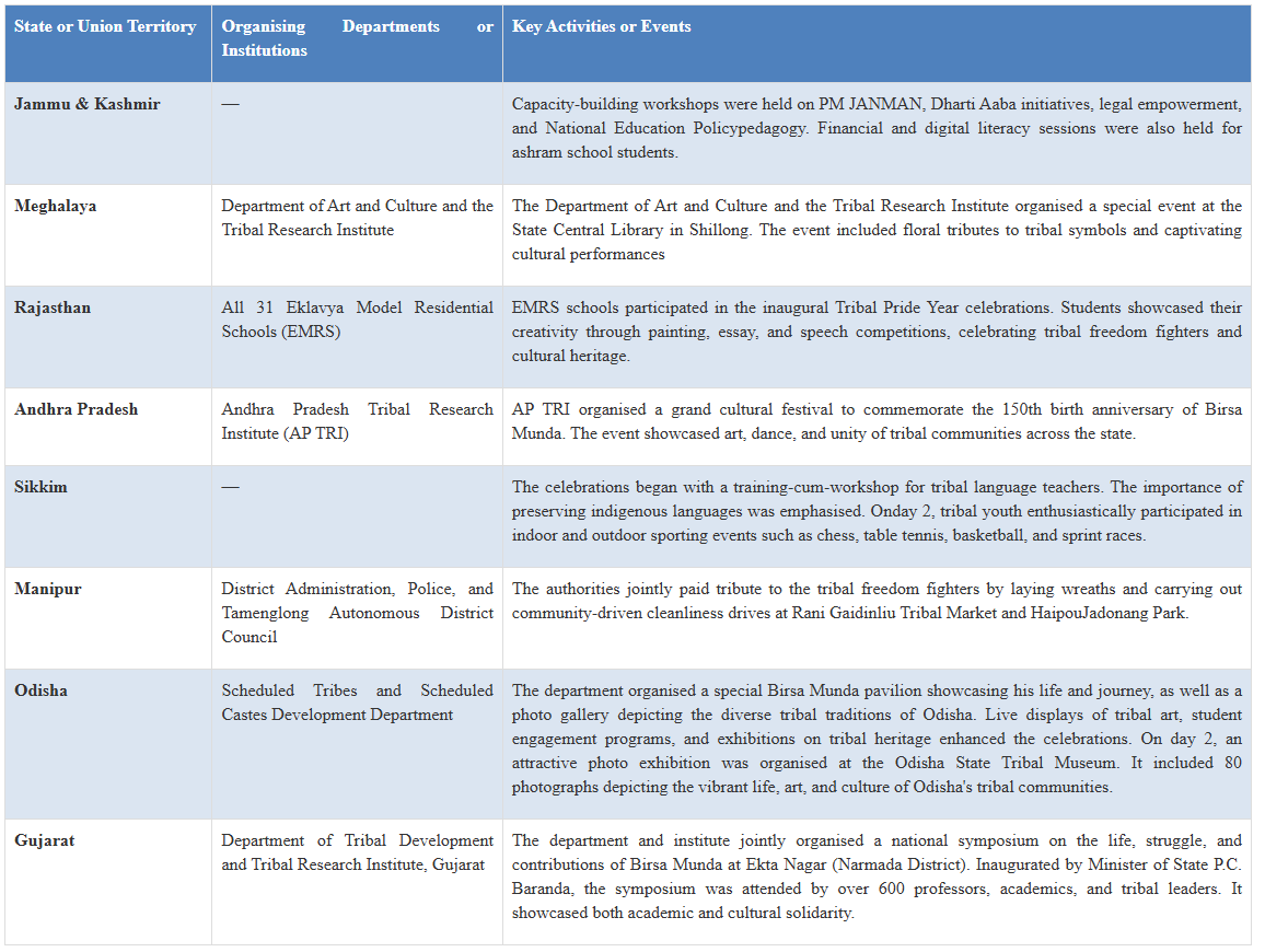 ১৫ নভেম্বর জনজাতি সম্প্রদায়ের স্বাধীনতা সংগ্রামী বিরসা মুণ্ডার জন্মবার্ষিকী উপলক্ষে জনজাতীয় গৌরব দিবস (আদিবাসী গর্বের দিন) হিসেবে পালিত হয়।