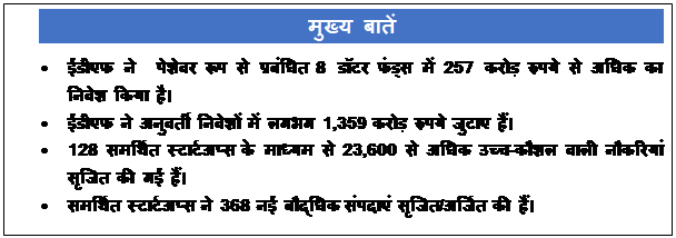 - इन डॉटर फंड्स ने 128 स्टार्टअप्स और उपक्रमों में 1,335.77 करोड़ का अतिरिक्त निवेश किया है।