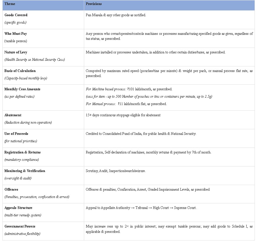 স্বাস্থ্য সুরক্ষা থেকে জাতীয় সুরক্ষা সেস বিল,২০২৫, একটি বিশেষ আবগারি সেস-এর জন্য স্পষ্ট আইনি কাঠামো তৈরি করতে প্রবর্তন করা হয়েছে। এই বিলটি হাইব্রিড প্রক্রিয়ায় পণ্য উৎপাদন বা তৈরির জন্য স্থাপিত যন্ত্রপাতির ওপর সেস ধার্যের প্রস্তাব করেছে। এই সেস থেকে প্রাপ্ত অর্থ ভারতের একত্রিত তহবিলে জমা হবে এবং জাতীয় নিরাপত্তা ও জনস্বাস্থ্য সংক্রান্ত খরচ মেটাতে সরকারকে সহায়তা করবে। প্রাথমিকভাবে এটি পান মসলার উপর প্রযোজ্য হলেও, সরকার প্রয়োজন হলে অন্যান্য পণ্যেও এটি বাড়াতে পারে। এই বিলটি শুধুমাত্র একটি প্রযুক্তিগত কর সংশোধন নয় বরং এটি একটি সুসংগঠিত, নিয়মতান্ত্রিক কাঠামোর মাধ্যমে স্থিতিশীল রাজস্ব নিশ্চিত করার বৃহত্তর প্রয়াসের অংশ, যা কর আরোপ ও প্রশাসনে স্বচ্ছতা, ন্যায্যতা এবং জবাবদিহিতা বজায় রেখে জাতীয় অগ্রাধিকারে নির্দিষ্ট পণ্যগুলির ন্যায্য অবদান নিশ্চিত করার লক্ষ্য রাখে।