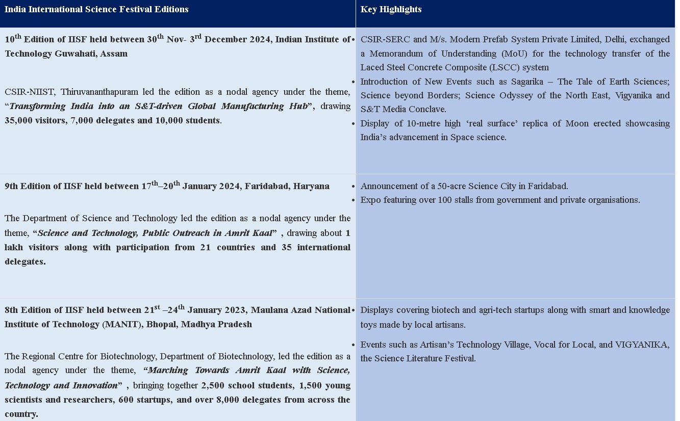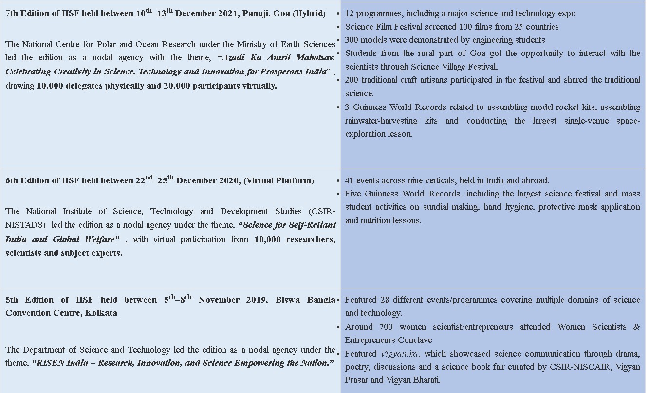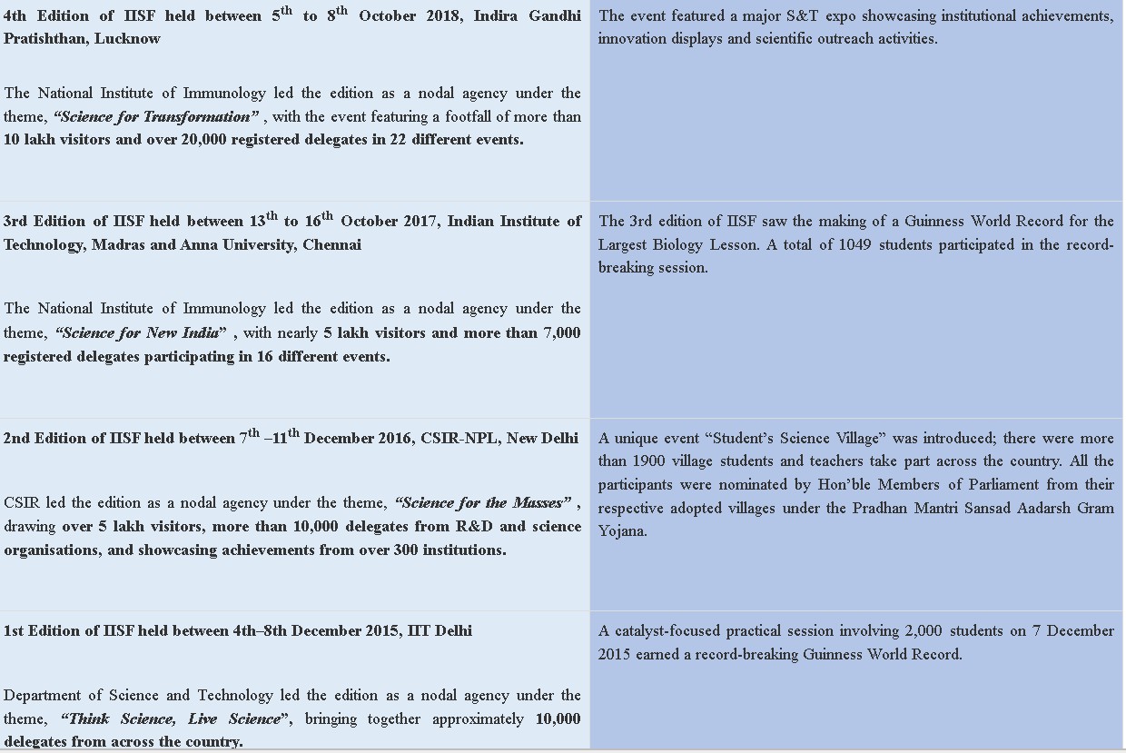 ২০১৫ সালে শুরু হওয়ার পর থেকে আইআইএসএফ এক দশক ধরে দেশের উন্নয়নমূলক এজেন্ডার কেন্দ্রে বিজ্ঞানকে স্থাপন করার জাতীয় প্রয়াসকে এগিয়ে নিয়ে চলেছে। এই উৎসব বৈজ্ঞানিক আদান-প্রদান, উদ্ভাবন এবং জনসংযোগের একটি প্রধান প্ল্যাটফর্মে পরিণত হয়েছে।