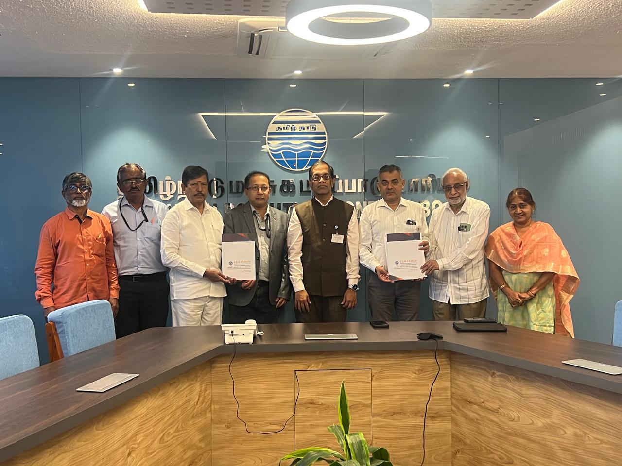 The technology transfer ceremony was attended by CSIR-CSMCRI Director Dr. Kannan Srinivasan, Chief Scientist Dr. Arvind Kumar, and Dr. Kamalesh Prasad, Head of Business Development. Distinguished guests included Dr. Palanisamy Thanikaivelan, Director of CSIR-CLRI, and Dr. K J Sreeram, former Director of CSIR-CLRI. The event was held at the Tamil Nadu Pollution Control Board (TNPCB) office in Chennai, in the presence of TNPCB Chairperson Ms. Jayanthi Murali on December 04, 2025.