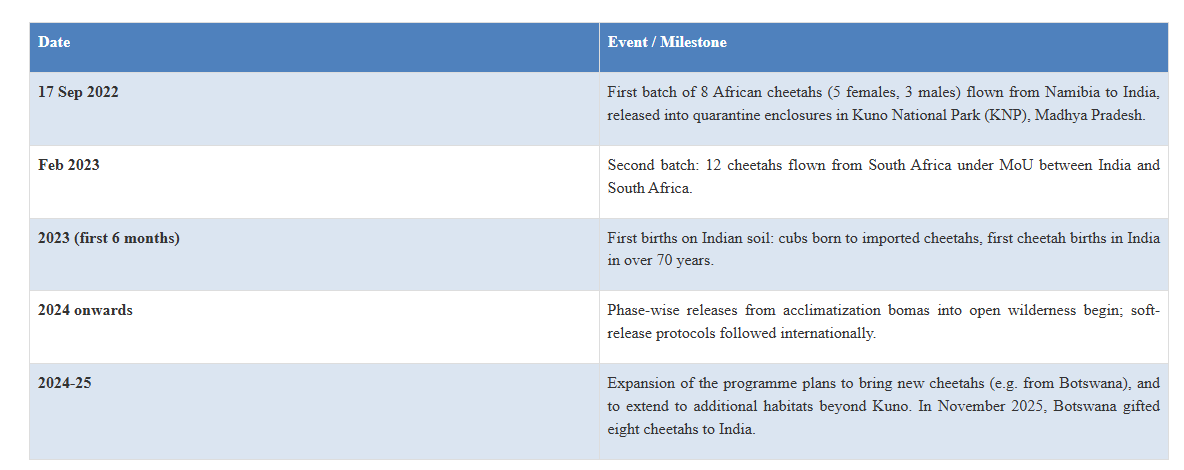 বিশ্বের প্রথম আন্তঃমহাদেশীয় বৃহৎ মাংসাশী প্রাণীর পুনর্বাসন সফলভাবে সম্পন্ন হয়েছে; নামিবিয়া ও দক্ষিণ আফ্রিকা থেকে (২০২২–২৩) ২০-টি চিতা ভারতে এসেছে।