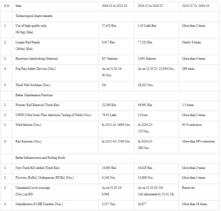 ରେଳ ଚଳାଚଳ କ୍ଷେତ୍ରରେ ନିରାପତ୍ତା ବୃଦ୍ଧି ପାଇଁ ଭାରତୀୟ ରେଳବାଇ ପକ୍ଷରୁ ବିଭିନ୍ନ ପଦକ୍ଷେପ ନିଆଯାଉଛି । ଏହାର ଫଳସ୍ବରୂପ ୨୦୧୪-୧୫ରେ ରେଳ ଦୁର୍ଘଟଣା ସଂଖ୍ୟା ୧୩୫ ଥିବାବେଳେ ୨୦୨୪-୨୫ ସୁଦ୍ଧା ଏହା ୩୧କୁ ହ୍ରାସ ପାଇଛି । ସେହିପରି ୨୦୦୪-୧୪ ମଧ୍ୟରେ ମୋଟ ୧୭୧୧ଟି ରେଳ ଦୁର୍ଘଟଣା ହୋଇଥିଲା ଅର୍ଥାତ ବାର୍ଷିକ ହାରାହାରି ୧୭୧ଟି ଦୁର୍ଘଟଣା ହୋଇଥିଲା । ଏହା ୨୦୨୪-୨୫ ସୁଦ୍ଧା ଏହା ୩୧କୁ ଓ ୨୦୨୫-୨୬ରେ ନଭେମ୍ବର ସୁଦ୍ଧା ମାତ୍ର ୧୧କୁ ହ୍ରାସ ପାଇଛି ।