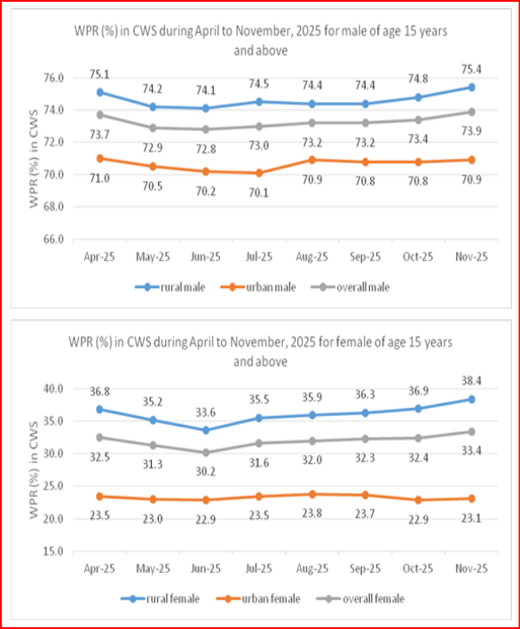 ବିଭିନ୍ନ କ୍ଷେତ୍ରରେ କର୍ମଶକ୍ତିକୁ ସୁଦୃଢ଼ କରାଯାଇଛି: ନଭେମ୍ବର ୨୦୨୫ରେ ୧୫ ବର୍ଷ ଏବଂ ତଦୁର୍ଦ୍ଧ୍ୱ ବୟସର ବ୍ୟକ୍ତିଙ୍କ ପାଇଁ ଶ୍ରମିକ ଜନସଂଖ୍ୟା ଅନୁପାତ (ଡବ୍ଲୁପିଆର) ବ୍ୟାପକ ଭାବରେ ଉନ୍ନତିର ଧାରା ଦେଖାଇଛି। ଗ୍ରାମାଞ୍ଚଳରେ, ଡବ୍ଲୁପିଆର ଏପ୍ରିଲ ୨୦୨୫ରେ ୫୫.୪ ପ୍ରତିଶତରୁ ନଭେମ୍ବର ୨୦୨୫ ରେ ୫୬.୩ ପ୍ରତିଶତକୁ ବୃଦ୍ଧି ପାଇଛି, ଯେତେବେଳେ ସାମଗ୍ରିକ ଡବ୍ଲୁପିଆର ସମାନ ସମୟ ମଧ୍ୟରେ ୫୨.୮ ପ୍ରତିଶତରୁ ୫୩.୨ ପ୍ରତିଶତକୁ ବୃଦ୍ଧି ପାଇଛି। ସହରାଞ୍ଚଳ ଡବ୍ଲୁପିଆର ପ୍ରାୟତଃ ସ୍ଥିର ରହିଛି। ଗୁରୁତ୍ୱପୂର୍ଣ୍ଣ କଥା ହେଉଛି, ଗ୍ରାମାଞ୍ଚଳ ମହିଳା ଡବ୍ଲୁପିଆର ଏପ୍ରିଲ ୨୦୨୫ରେ ୩୬.୮ ପ୍ରତିଶତରୁ ନଭେମ୍ବର ୨୦୨୫ରେ ୩୮.୪ ପ୍ରତିଶତକୁ ବୃଦ୍ଧି ପାଇଛି, ଯାହା ଫଳରେ ଏହି ସମୟ ମଧ୍ୟରେ ସାମଗ୍ରିକ ମହିଳା ଡବ୍ଲୁପିଆର ୩୨.୫ ପ୍ରତିଶତରୁ ୩୩.୪ ପ୍ରତିଶତକୁ ବୃଦ୍ଧି ପାଇଛି।