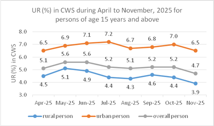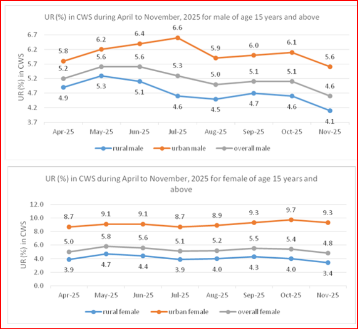 ସାମଗ୍ରିକ ବେକାରୀ ହାର (ୟୁଆର) ହ୍ରାସ ପାଇଛି: ୧୫ ବର୍ଷ ଏବଂ ତଦୁର୍ଦ୍ଧ୍ୱ ବୟସର ଲୋକଙ୍କ ମଧ୍ୟରେ ବେକାରୀ ହାର ନଭେମ୍ବର ୨୦୨୫ରେ ୪.୭ ପ୍ରତିଶତକୁ ହ୍ରାସ ପାଇଛି, ଯାହା ଏପ୍ରିଲ ୨୦୨୫ ପରେ ସର୍ବନିମ୍ନ ସ୍ତର। ନଭେମ୍ବର ୨୦୨୫ରେ, ଗ୍ରାମୀଣ ବେକାରୀ ହାର ୩.୯ ପ୍ରତିଶତର ନୂତନ ସର୍ବନିମ୍ନ ସ୍ତରକୁ ଖସିଆସିଥିଲା, ଯେତେବେଳେ ସହରାଞ୍ଚଳ ବେକାରୀ ହାର ୬.୫ ପ୍ରତିଶତକୁ ହ୍ରାସ ପାଇଛି, ଯାହା ଏପ୍ରିଲ ୨୦୨୫ରେ ରେକର୍ଡ କରାଯାଇଥିବା ପୂର୍ବ ସର୍ବନିମ୍ନ ସ୍ତର ସହିତ ସମାନ।