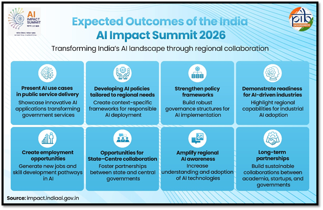 توقع ہے کہ انڈیا اے آئی امپیکٹ سمٹ 2026شہریوں پر مرکوز اور نتائج پر مبنی اقدامات فراہم کرے گا جو قومی ترجیحات کے ساتھ ہم آہنگ ہوں۔ سمٹ عملی اے آئی نفاذ، پالیسی کی ہم آہنگی اور ادارہ جاتی تعاون پر زور دے گا تاکہ حکومت اور صنعت میں مؤثر نفاذ کو سپورٹ کیا جا سکے۔ یہ حکمرانی اور ریگولیٹری فریم ورک کو مضبوط کرے گا، اے آئی پر مبنی صنعتی ترقی کے لیے علاقائی تیاری کا جائزہ لے گا اور مہارت کی ترقی اور افرادی قوت کی تبدیلی کو فروغ دے گا۔ سمٹ اے آئی کے اطلاقات کے بارے میں آگاہی اور سمجھ بوج کو بھی بڑھائے گا اور حکومت، علمی اداروں، اسٹارٹ اپس، اور صنعت کے درمیان پائیدار شراکت داری کو فروغ دے گا تاکہ اے آئی ماحولیاتی نظام کی ذمہ دار اور جامع ترقی ممکن ہو سکے۔