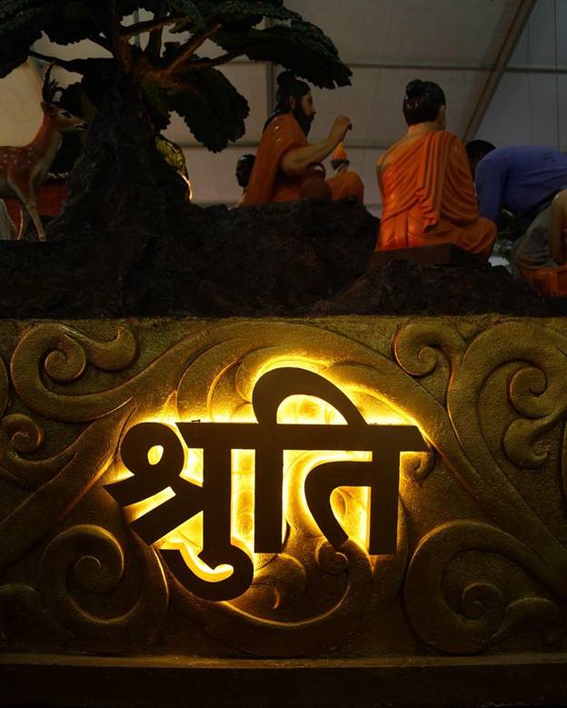 শ্ৰুতি হৈছে ভাৰতৰ চহকী মৌখিক উত্তৰাধিকাৰিত্বৰ প্ৰতীক, বটবৃক্ষৰ তলত শিষ্যসকলক জ্ঞান প্ৰদান কৰা গুৰুৰ জৰিয়তে চিত্ৰিত কৰা হৈছে, যাৰ লগত ওঁম-ৰ মহাজাগতিক অনুনাদ আৰু জ্ঞানৰ উৎপত্তিক প্ৰতিনিধিত্ব কৰা শব্দ-তৰংগৰ ৰূপাংকন কৰা হৈছে।
