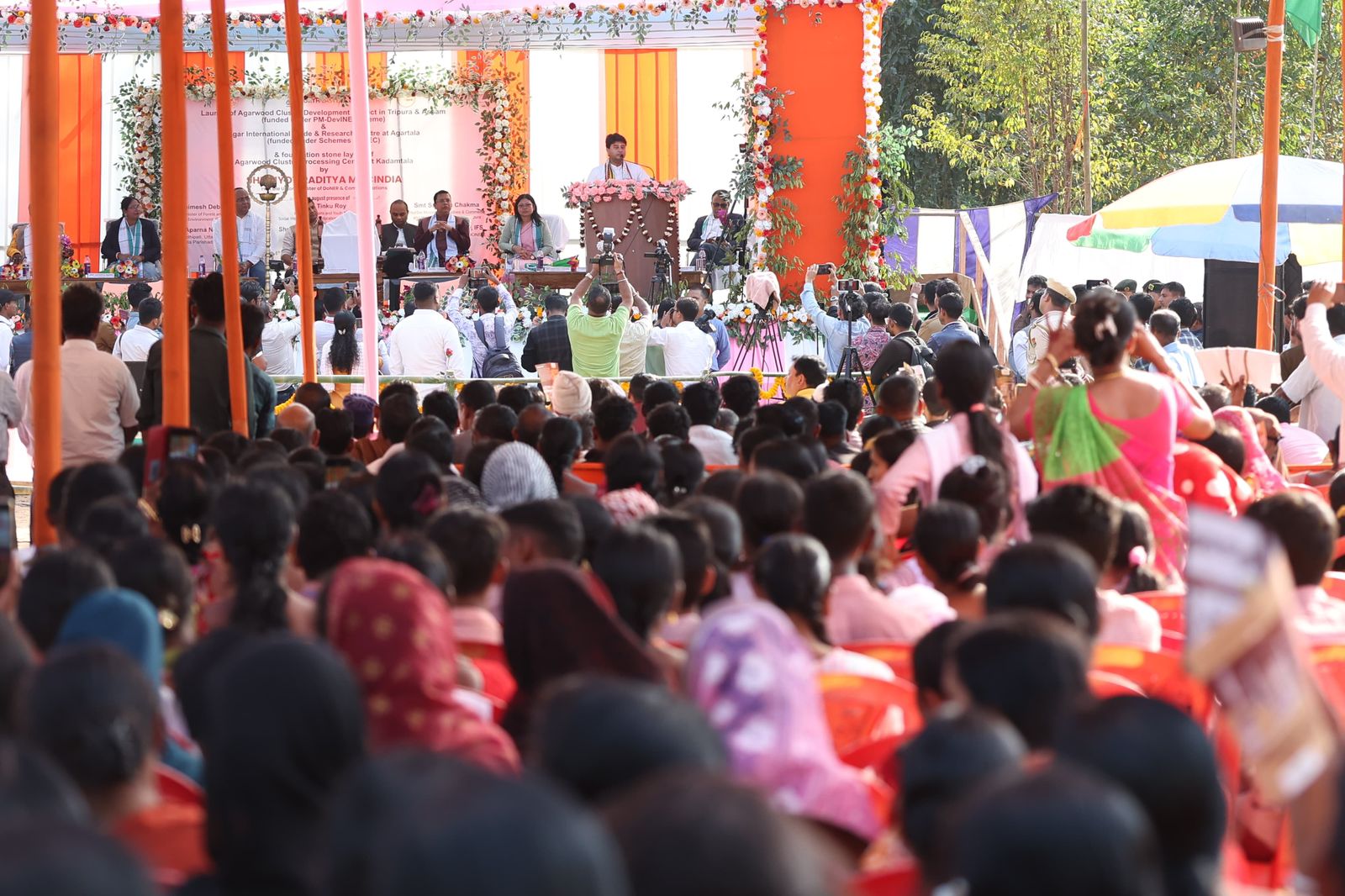 অনুষ্ঠানত কেন্দ্ৰীয় মন্ত্ৰীগৰাকীয়ে কয় যে প্ৰধানমন্ত্ৰী নৰেন্দ্ৰ মোদীৰ উন্নত উত্তৰ-পূবৰ দৃষ্টিভংগীৰ অধীনত তেওঁ এই ভ্ৰমণৰ সময়ত অঞ্চলটোৰ বাবে কেইবাটাও উন্নয়নমূলক পদক্ষেপ লৈছে। ইয়াৰে কিছুমান শুকুৰবাৰে ভ্ৰমণৰ প্ৰথম দিনটোত জনসাধাৰণৰ প্ৰতি উৎসৰ্গা কৰা হৈছিল, আজি সাঁচি কাঠৰ মূল্য শৃংখলৰ আধাৰশিলা স্থাপন কৰা হৈছে আৰু কাইলৈ এই ভ্ৰমণৰ অন্যতম বৃহৎ উপহাৰ হিচাপে মাতাবাৰী পৰ্যটন চাৰ্কিট উদ্বোধন কৰা হ'ব। শ্ৰী সিন্ধিয়াই কয় যে ভাৰতৰ সাঁচি কাঠ উৎপাদন ক্ষমতা মূলতঃ ত্ৰিপুৰা আৰু অসমত কেন্দ্ৰীভূত আৰু এই আঁচনিখনৰ লক্ষ্য হৈছে দুয়োখন ৰাজ্যৰ শক্তিত নতুন শক্তি প্ৰৱাহিত কৰা।