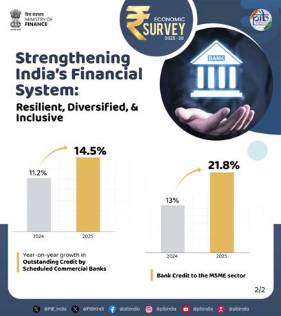 A significant improvement has been observed in the asset quality of Scheduled Commercial Banks (SCBs), states the Economic Survey 2025-26 that was tabled in the Parliament today by the Union Minister for Finance and Corporate Affairs Smt. Nirmala Sitharaman.. The gross non-performing asset (GNPA) ratio and net NPA ratio have reached a multi-decadal low level and record low level, respectively. At the same time, the capital-to-risk-weighted-asset ratio (CRAR) of the SCBs remained strong at 17.2 per cent as of September 2025.Further, the recovery rate in NPAs in SCBs has approximately doubled from 13.2 per cent in FY18 to 26.2 per cent in FY25. The recovery rate through the Insolvency and Bankruptcy Code, 2016 (IBC Code) has improved significantly as well.