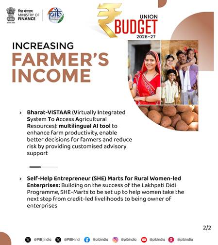 কেন্দ্ৰীয় বাজেটত ‘ভাৰত-বিস্তাৰ’ (কৃষি সম্পদ আহৰণৰ বাবে ভাৰ্চুৱেলি ইন্টিগ্ৰেটেড চিষ্টেম)-এক বহুভাষিক এ আই সঁজুলিৰ প্ৰস্তাৱ দিয়া হৈছে যিয়ে এগ্ৰিষ্টেক পৰ্টেল আৰু কৃষি পদ্ধতিৰ ওপৰত আই চি এ আৰ পেকেজক এ আই চিষ্টেমৰ সৈতে একত্ৰিত কৰিব। ই কৃষি উৎপাদনশীলতা বৃদ্ধি কৰিব, কৃষকৰ সিদ্ধান্ত গ্ৰহণ উন্নত কৰিব আৰু কৃষকৰ বাবে অনুকূলিত পৰামৰ্শমূলক সমৰ্থনৰ জৰিয়তে বিপদাশংকা হ্ৰাস কৰিব।