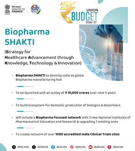 কেন্দ্ৰীয় বাজেট ২০২৬-২৭ত বায়'ফাৰ্মা শক্তি (জ্ঞান, প্ৰযুক্তি আৰু উদ্ভাৱনৰ জৰিয়তে স্বাস্থ্যসেৱাৰ উন্নতিৰ কৌশল)ৰ প্ৰস্তাৱ