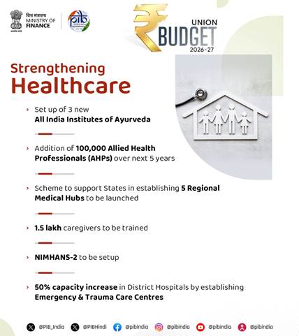 উত্তৰ ভাৰতত মানসিক স্বাস্থ্যসেৱাৰ বাবে ৰাষ্ট্ৰীয় প্ৰতিষ্ঠানৰ অভাৱৰ কথাও উল্লেখ কৰে বিত্তমন্ত্ৰীগৰাকীয়ে। সেয়েহে কেন্দ্ৰীয় বাজেটত নিমহান্স-২ স্থাপন আৰু ৰাঁচি আৰু তেজপুৰৰ ৰাষ্ট্ৰীয় মানসিক স্বাস্থ্য প্ৰতিষ্ঠানক আঞ্চলিক শীৰ্ষ প্ৰতিষ্ঠান হিচাপে উন্নীতকৰণৰ কথা ঘোষণা কৰা হয়। তদুপৰি, জৰুৰীকালীন আৰু ট্ৰমা কেয়াৰ চেণ্টাৰ স্থাপন কৰি জিলা চিকিৎসালয়সমূহৰ জৰুৰীকালীন ক্ষমতা শক্তিশালী কৰাৰ লগতে এই ক্ষমতা ৫০% বৃদ্ধি কৰা হ’ব।