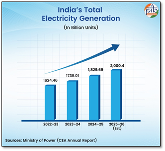 ভারত বর্তমানে বিশ্বের শীর্ষ তিন শক্তি ব্যবহারকারী দেশের অন্যতম। প্রতি বছর-ই বিদ্যুতের চাহিদা বাড়ছে। মোট বিদ্যুৎ উৎপাদন ২০২৩–২৪ সালে ১,৭৩৯.০৯ বিলিয়ন ইউনিট থেকে ২০২৪–২৫ সালে ১,৮২৯.৬৯ বিলিয়ন ইউনিটে উন্নীত হয়েছে। বৃদ্ধি ৫.২১ শতাংশ। ২০২৫–২৬ সালের জন্য উৎপাদন লক্ষ্য নির্ধারিত হয়েছে ২,০০০.৪ বিলিয়ন ইউনিট।