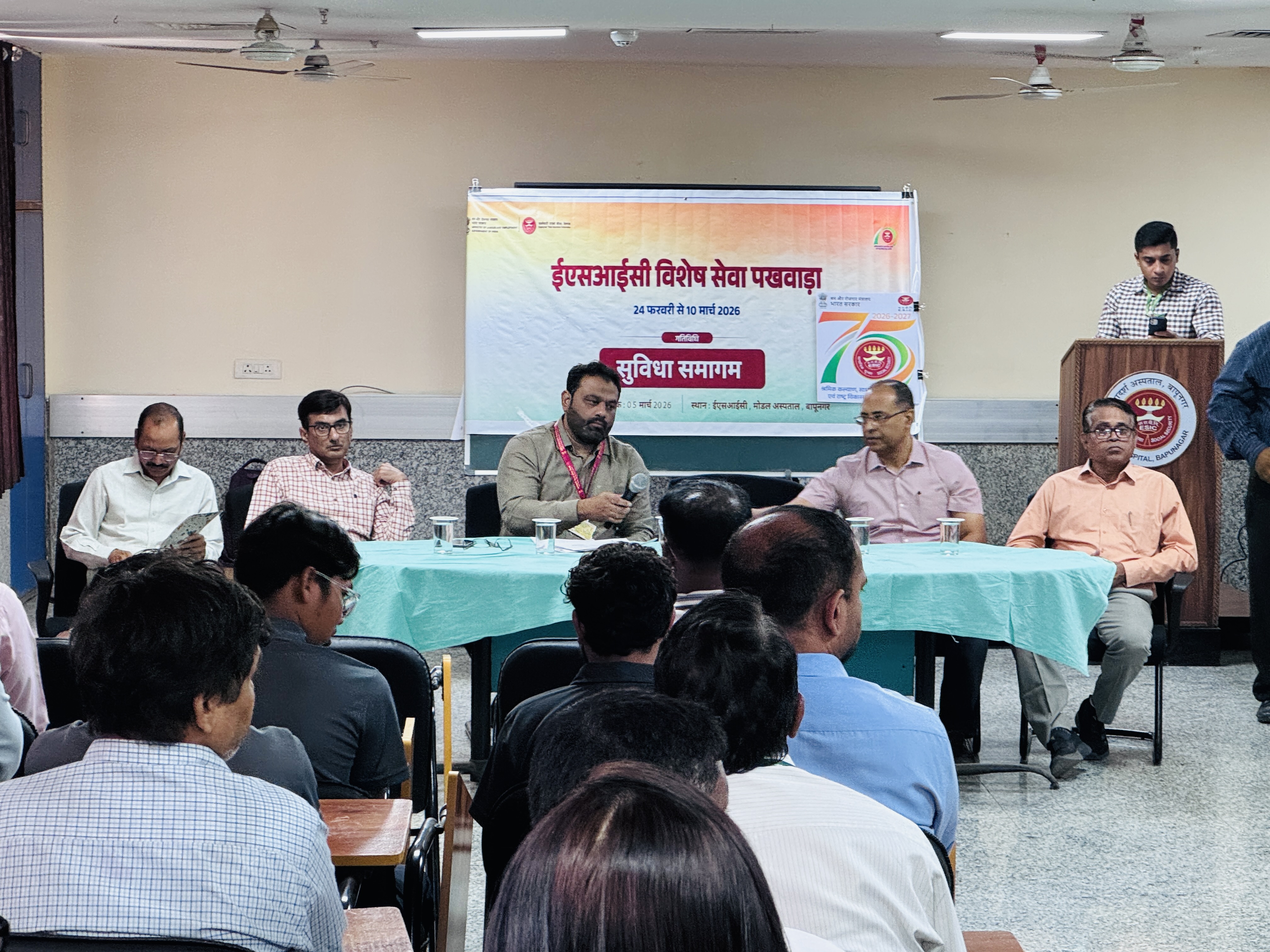 In this regard, a Suvidha Samagam was organized on 05 March 2026 at ESIC Model Hospital, Bapunagar, Ahmedabad. The programme was attended by Shri Gautam Kumar, Joint Director, Dr. Shahid Malek, State Medical Officer, Dr. Swetal Pastagia, Medical Superintendent (In-charge), Shri Vivek Awasthi, Deputy Director, Shri Shyam Sundar, Assistant Director, along with other officials.