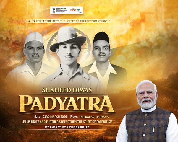 In a solemn tribute to the unparalleled sacrifice of India’s young freedom fighters - Shaheed Bhagat Singh, Shaheed Shivaram Rajguru, and Shaeed Sukhdev Thapar, the Ministry of Youth Affairs and Sports, through Mera Yuva Bharat (MY Bharat), will organise a nationwide Padyatra on March 23rd, 2026, marking Shaheed Diwas. The initiative will be conducted under the theme “MY Bharat, My Responsibility.”