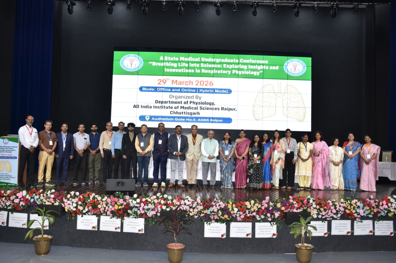 अखिल भारतीय आयुर्विज्ञान संस्थान रायपुर के फिजियोलॉजी विभाग द्वारा रेस्पिरेटरी फिजियोलॉजी विषय पर राज्य स्तरीय स्नातक (अंडरग्रेजुएट) सम्मेलन का सफल आयोजन किया गया। “Breathing Life into Science: Exploring Insights and Innovations in Respiratory Physiology” विषय पर आयोजित इस सम्मेलन में प्रदेश के 15 मेडिकल कॉलेजों से 250 से अधिक प्रथम वर्ष एमबीबीएस (बैचलर ऑफ मेडिसिन एंड बैचलर ऑफ सर्जरी) छात्रों ने भाग लिया। कार्यक्रम में विभिन्न संस्थानों के फिजियोलॉजी विभागाध्यक्ष एवं संकाय सदस्य भी उपस्थित रहे।