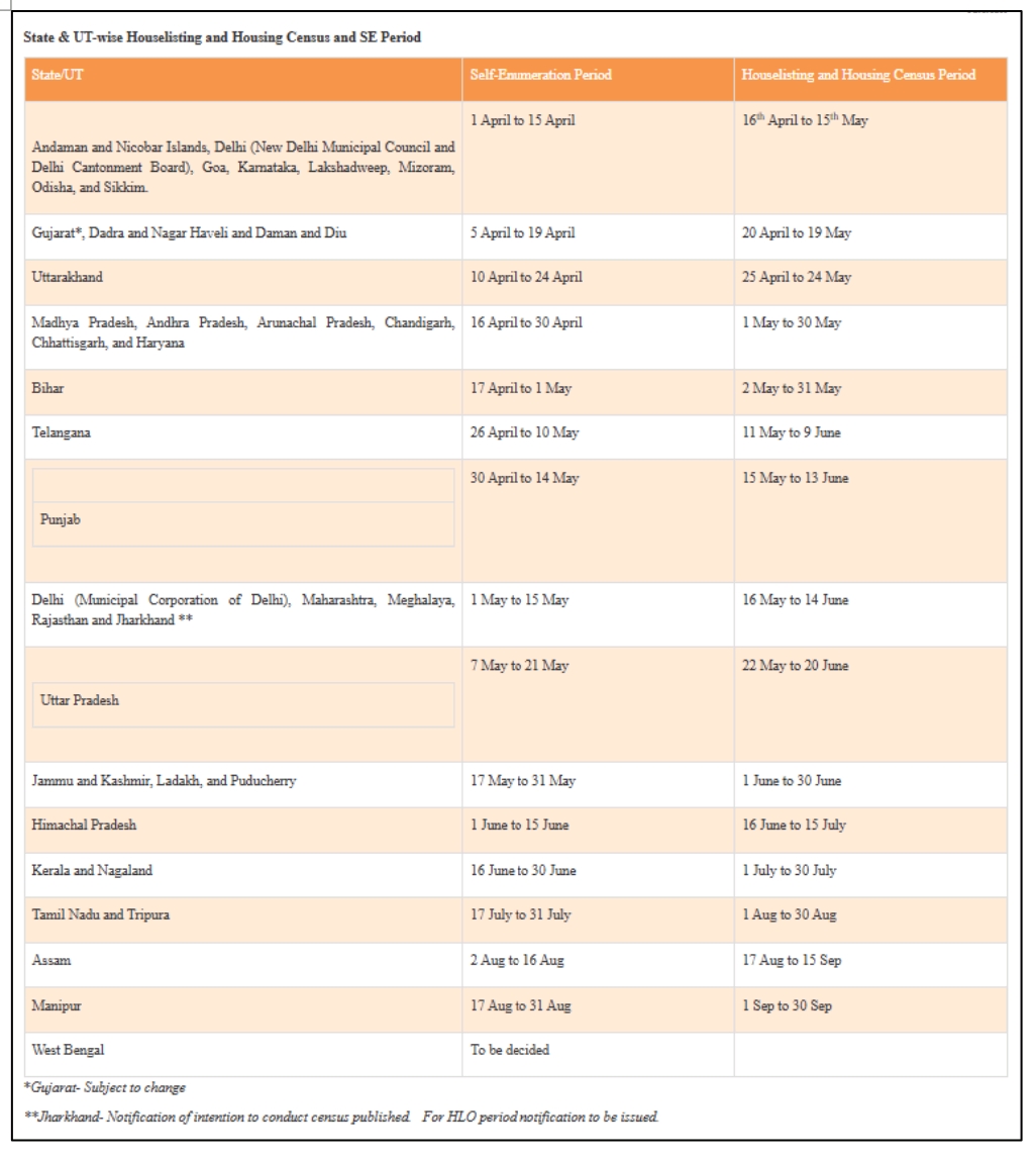ଆଣ୍ଡାମାନ ଏବଂ ନିକୋବର ଦ୍ୱୀପପୁଞ୍ଜ, ଦିଲ୍ଲୀ (ନୂଆଦିଲ୍ଲୀ ମ୍ୟୁନିସିପାଲ କାଉନସିଲ ଏବଂ ଦିଲ୍ଲୀ କ୍ୟାଣ୍ଟନମେଣ୍ଟ ବୋର୍ଡ), ଗୋଆ, କର୍ଣ୍ଣାଟକ, ଲାକ୍ଷାଦ୍ୱୀପ, ମିଜୋରାମ, ଓଡ଼ିଶା ଏବଂ ସିକିମରେ ଘର ତାଲିକା ଏବଂ ଘର ଗଣନା ଏପ୍ରିଲ ୧୬ ରୁ ମଇ ୧୫, ୨୦୨୬ ମଧ୍ୟରେ କରାଯିବ। ଏହାପୂର୍ବରୁ ଏପ୍ରିଲ ୧ରୁ ୧୫, ୨୦୨୬ ପର୍ଯ୍ୟନ୍ତ ସ୍ବଗଣନା ପାଇଁ ସୁଯୋଗ ରହିବ। ମଧ୍ୟପ୍ରଦେଶ, ଆନ୍ଧ୍ର ପ୍ରଦେଶ, ଅରୁଣାଚଳ ପ୍ରଦେଶ, ଚଣ୍ଡିଗଡ଼, ଛତିଶଗଡ଼ ଏବଂ ହରିୟାଣାରେ, ଏହି କାର୍ଯ୍ୟ ୧ ମେ ରୁ ମଇ ୩୦, ୨୦୨୬ ପର୍ଯ୍ୟନ୍ତ ହେବ, ସେହିପରି ଆତ୍ମ-ଗଣନା ଅବଧି ଏପ୍ରିଲ ୧୬ ରୁ ୩୦, ୨୦୨୬ ପର୍ଯ୍ୟନ୍ତ ରହିବ। ଏକ ବିସ୍ତୃତ ରାଜ୍ୟ/କେନ୍ଦ୍ରଶାସିତ ଅଞ୍ଚଳ-ୱାରୀ କାର୍ଯ୍ୟସୂଚୀ ପରିଶିଷ୍ଟରେ ସଂଲଗ୍ନ କରାଯାଇଛି। ଭାରତ ସରକାର ୨୦୨୭ ଜନଗଣନା ପାଇଁ ୧୧,୭୧୮.୨୪ କୋଟି ଟଙ୍କା ମଞ୍ଜୁର କରିଛନ୍ତି ତଥା ଗଣନାକାରୀଙ୍କ ପାଉଣା, ତାଲିମ, ଆଇଟି ଭିତ୍ତିଭୂମି, ଲଜିଷ୍ଟିକ୍ସ ଇତ୍ୟାଦି ପାଇଁ ପର୍ଯ୍ୟାପ୍ତ ବ୍ୟବସ୍ଥା କରିଛନ୍ତି।
