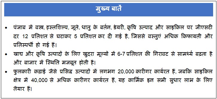 हाल ही में जीएसटी सुधारों से आवश्यक वस्तुओं और सेवाओं पर कर का बोझ कम हो गया है, जिसका उद्देश्य मांग को बढ़ावा देना, प्रतिस्पर्धा को बढ़ाना तथा विकास और रोजगार के अवसर पैदा करना है। भारत के उत्तर-पश्चिम में स्थित पंजाब में, कृषि राज्य की अर्थव्यवस्था की रीढ़ बनी हुई है, जो वस्त्र, हस्तशिल्प, धातु के बर्तन और कृषि-आधारित उत्पादों जैसे उद्योगों द्वारा पूरित किया जाता है। ये सुधार इन वस्तुओं को अधिक किफायती और प्रतिस्पर्धी बनाते हैं, जो अपनी कृषि नींव को मजबूत करने से लेकर विनिर्माण और निर्यात-उन्मुख क्षेत्रों को बढ़ावा देने तक राज्य की विकास प्राथमिकताओं के साथ निकटता से मेल खाते हैं।