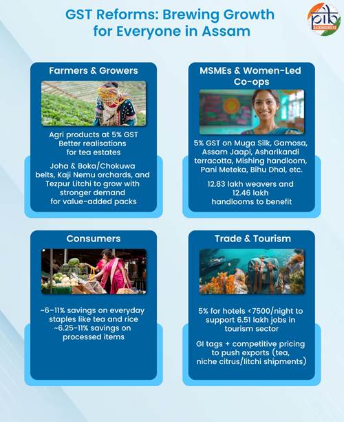 শেহতীয়াকৈ জিএছটি সংস্কাৰ সাধনৰ ফলশ্ৰুতিত অসমৰ অৰ্থনীতিৰ ভিন্ন খণ্ডৰ উত্থান ঘটিব বুলি আশা কৰা হৈছে। ঘন চাহ বাগিচা, আকৰ্ষণীয় ৰেচম, স্পন্দনশীল হস্তশিল্প আৰু চহকী জৈৱ-বৈচিত্ৰ্যৰ বাবে পৰিচিত ৰাজ্যখন অৰ্থনৈতিকভাৱে যথেষ্ট লাভৱান হ’ব। ইয়াৰ ফলশ্ৰুতিত ইনপুট ব্যয় হ্ৰাস, মূল্যৰ প্ৰতিযোগিতামূলক ক্ষমতাৰ অগ্ৰগতি সাধন আৰু চাহিদা বৃদ্ধি পাব।