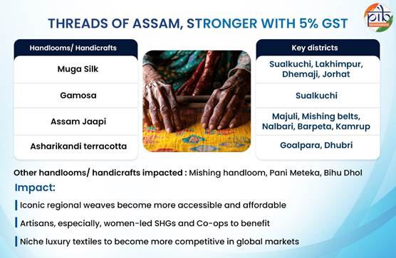 হস্ততাঁত আৰু শিল্পৰ নতুন ৫% জিএছটি হাৰে সমগ্ৰ গোৱালপাৰা/ ধুবুৰী, মাজুলী/ মিছিং বেল্ট আৰু নলবাৰী/ বৰপেটা/ কামৰূপৰ অসমৰ জাপি, আশৰিকান্দিৰ টেৰাকোটা, মিছিং হস্ততাঁত, পানী মেটেকা আৰু বিহু ঢোল আদিক উপকৃত কৰিব।