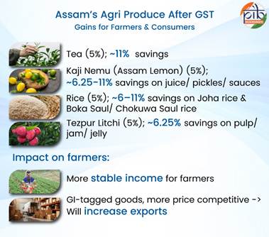 নতুন হাৰে পূৰ্বৰ স্লেবৰ তুলনাত ~৬–১১% ব্যয় হ্ৰাস কৰিব বুলি আশা কৰা হৈছে। ইয়াৰ ফলত উপভোক্তাসকলৰ বাবে সামগ্ৰীসমূহ অধিক সুলভ হ’ব আৰু চাহিদা বৃদ্ধিয়ে কৃষক ৰাইজলৈ অধিক আয়ৰ সঞ্চাৰ কৰিব।
