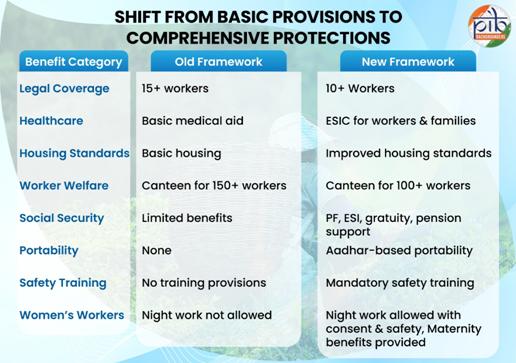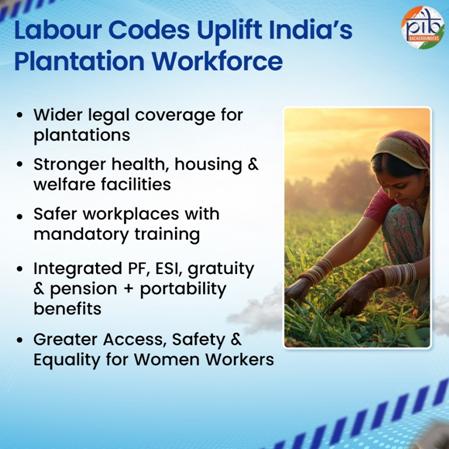 - नई श्रम संहिताएँ समरूप मानक स्थापित करती हैं, जो बागान श्रमिकों की सुरक्षा को मजबूत करती हैं और इस क्षेत्र में अनुपालन को सरल बनाती हैं