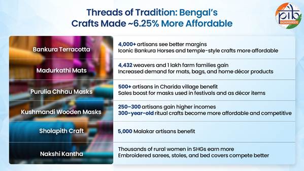 These changes will directly empower artisans, farmers, and small entrepreneurs of Bengal, making their products more competitive in both domestic and global markets. This will not only promote Bengal’s artisanal heritage but also strengthen local economies across districts.