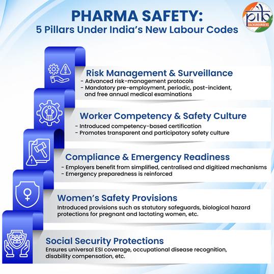 Under these reforms, the drugs and pharmaceutical sector is placed under a unified and comprehensive regulatory framework. Through the newly notified Occupational Safety, Health and Working Conditions (OSHWC) Code, 2020 and the Social Security Code, 2020, the sector now operates within strengthened safety, health, and social-security governance, supported by capacity building and competency-led framework. Risk-based oversight, documented safety systems, periodic medical surveillance, and an evolving inspector-cum-facilitator model collectively promote scientific hazard management and prevention-focused governance.
