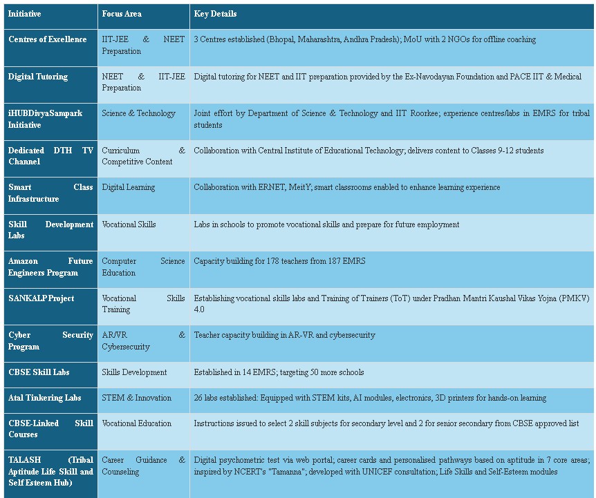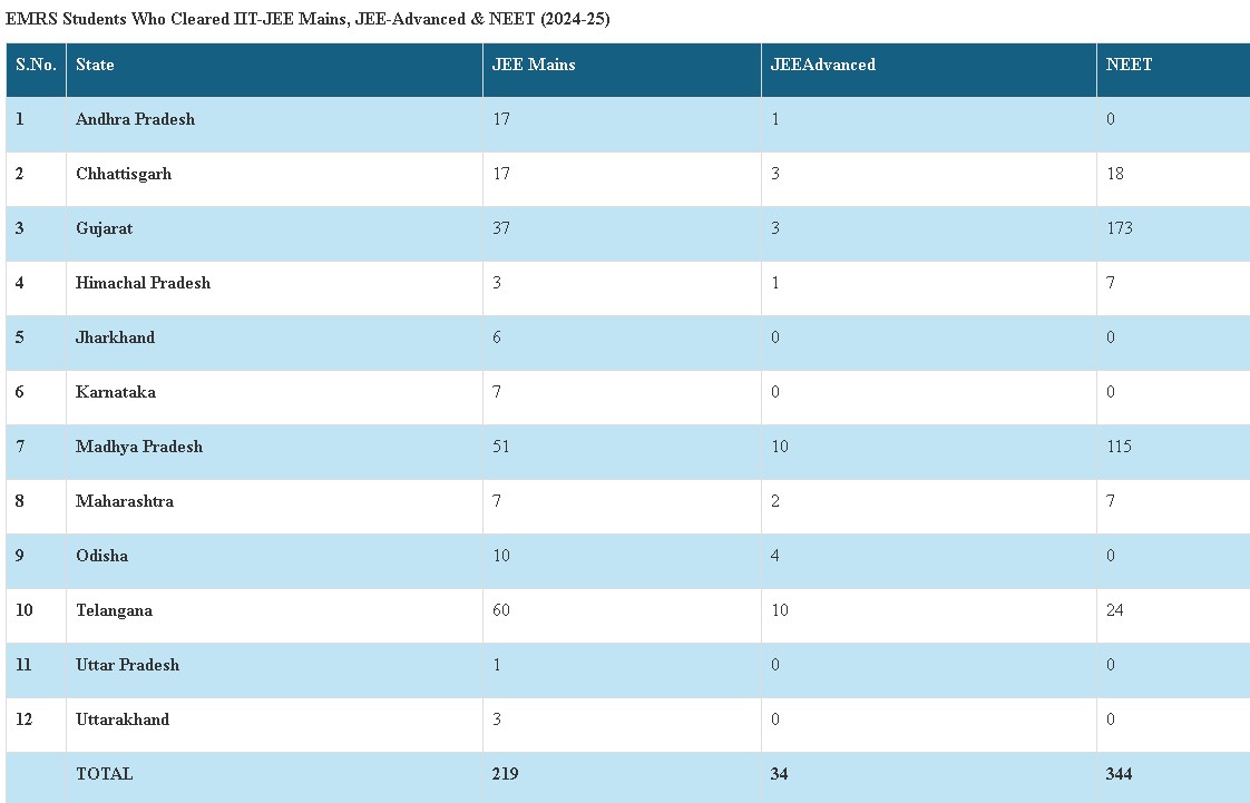 দূর-দূরান্তের আদিবাসী গ্রাম থেকে উঠে এসে, ২০২৪-২৫ শিক্ষাবর্ষে একলব্য মডেল রেসিডেনশিয়াল স্কুল (EMRS)-এর ৫৯৭ জন শিক্ষার্থী JEE Main, JEE Advanced এবং NEET-এর মতো ভারতের সর্বাধিক প্রতিযোগিতামূলক পরীক্ষায় উত্তীর্ণ হয়েছে, যা মাত্র ২ জন (২০২২–২৩) উত্তীর্ণ শিক্ষার্থী থেকে এক অসাধারণ অগ্রগতি। এই সাফল্য প্রমাণ করে যে লক্ষ্যভিত্তিক শিক্ষাসহায়তা কীভাবে দেশের সর্বাধিক বঞ্চিত ও দুর্গম এলাকায় বসবাসকারী তফসিলি উপজাতি শিক্ষার্থীদের জীবন বদলে দিচ্ছে। মোট ২৩০-টি EMRS-এর মধ্যে যেগুলিতে দ্বাদশ শ্রেণী পর্যন্ত পাঠদান হয়, তার মধ্যে ১০১-টি বিদ্যালয়ে শিক্ষার্থীরা এ বছর এই মর্যাদাপূর্ণ পরীক্ষাগুলি উত্তীর্ণ হয়েছে।