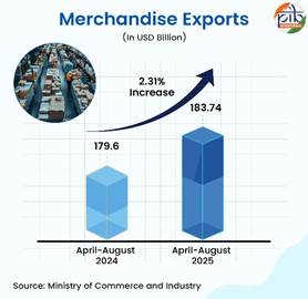 भारतको व्यापारिक निर्यात २०२५ मा माथितिर बढ़ीरहेको छ। यसले अप्रेल-अगस्त २०२५ मा २.३१ प्रतिशतको स्वस्थ वृद्धि दर्ता गरेको छ, जहाँ अप्रेल-अगस्त २०२४ को अवधि १७९.६० बिलियन अमेरिकी डलरको तुलनामा निर्यात १८३.७४ बिलियन अमेरिकी डलर थियो। यद्यपी पाँच महिनामध्ये १९ प्रतिशत मालवस्तु निर्यात केवल अगस्त २०२५ मा गरिएको थियो, जसमा पछिल्लो वर्षदेखि ६.६५ प्रतिशतको वृद्धि भएको थियो।