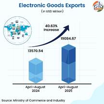 इलेक्ट्रोनिक वस्तुहरूले विकासको गतिलाई नेतृत्व गरेको छ, निर्यातमा ५.५१ बिलियन अमेरिकी डलरको वृद्धि भएको छ, जुन अप्रेल-अगस्त २०२५ मा पछिल्लो वर्ष यही अवधिको तुलनामा ४०.६३ प्रतिशको वृद्धि भएको छ। सामानले अगस्त २०२५ मा पनि पछिल्लो वर्षको तुलनामा २५.९१ प्रतिशतको वृद्धिको साथ उत्कृष्ट प्रदर्शन गरेको छ। पछिल्लो १० वर्षहरूमा इलेक्ट्रोनिक सामानहरूको उत्पादनमा ६ गुणा वृद्धि भएको छ अनि इलेक्ट्रोनिक सामानहरूको निर्यातमा ८ गुणा वृद्धि भएको छ। मेक इन इण्डिया अनि पीएलआई योजनाहरूद्वारा सञ्चालित संयुक्त राज्य अमेरिका, संयुक्त अरब अमीरात, चीन, नीदरल्याण्ड अनि यूकेसहित प्रमुख बजारहरूको साथ भारतीय इलेक्ट्रोनिक सामानहरूको निर्यात बढ़ीरहेको छ।