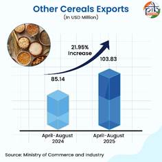 अप्रेल-अगस्त २०२४ को तुलनामा अप्रेल-अगस्त २०२५ मा भारतका अन्य अन्नहरूको निर्यातमा २१.९५ प्रतिशतको वृद्धि भएको छ। यसमा राय, जौं, ओट्स, फोनीय, किनुवा आदि सामेल छन्। यसमा गहुँ, चामल मकै अनि बाजरा सामेल छैन। अन्य अन्नहरूको वैश्विक मांगमा वृद्धिको पछाड़ीको कारण पौष्टिक अनि स्वास्थ्यप्रति जागरूक खाद्य उत्पादहरूप्रति जागरूकता हो। भारतको समृद्ध कृषि विरासतसितै यो अन्यले कृषि विविधतालाई बढ़ाउँदछ। खाद्य सुरक्षालाई बढ़ाउँदछ अनि निर्यातका नयाँ अवसर प्रदान गर्दछ। शीर्ष निर्यात गन्तव्य नेपाल, श्रीलंका, संयुक्त अरब अमीरात बंग्लादेश अनि भुटान हो।